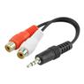 Cabo adaptador de áudio P2 macho para 2 conectores RCA fêmea, indicado para conversão e distribuição de sinal de áudio estéreo analógico.