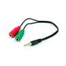 Cabo adaptador de áudio com conector P3 macho em uma extremidade e dois conectores P2 fêmea, indicado para adaptação de áudio e microfone em dispositivos compatíveis.