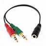 Cabo adaptador de áudio com conector P3 fêmea para dois conectores P2 macho, ideal para separar áudio e microfone em dispositivos compatíveis.