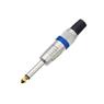Conector plug P10 mono na cor azul, indicado para montagem e reparo de cabos de áudio, com corpo metálico e acabamento reforçado.