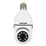 Câmera de segurança IP marca Jortan, modelo JT-8177, de uso interno/externo, design tipo lâmpada, com rotação ampla (˜ 360°), conexão WiFi, suporte para cartão microSD, visão noturna e controle por app.
